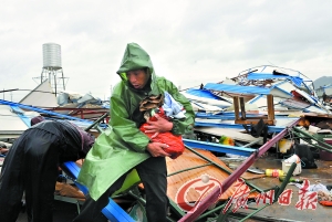 “鲇鱼”昨日绕过广东重创福建 本报记者全程驱车追风 昨日12时55分,今年第13号台风“鲇鱼”带着狂风暴雨在福建省漳浦县六鳌镇登陆。根据中央气象台的报告,“鲇鱼”登陆时中心附近最大风力有13级(38米/秒),为1949年以来登陆福建省最晚的台风。“鲇鱼”在漳浦登陆时,广州日报记者正好在福建漳浦与台风相遇,亲身见证了这条“鲇鱼”上岸时的威力。 “鲇鱼”给登陆地漳浦带来了严重破坏。据漳州市统计数据显示,截至昨晚6时,漳州九县八十乡共有约63万人受灾,倒塌房屋453间,直接经济损失超15亿元,尤其是给当地海产品养殖户造成极大损失,大量“鲍鱼”被冲上沙滩,数千渔船损毁。 23日12时55分 登陆福建省漳浦县六鳌镇 为1949年以来 登陆福建最晚台风 逐渐远离我省 登陆后向偏北方向移动 记者直击 渔民 从未见过如此狂风 随着“鲇鱼”的不断向东移动,已确定不会在粤东登陆后,按照中央气象台的预报,记者驱车来到“鲇鱼”台风最有可能登陆的福建漳州市漳浦县。果然,这条“鲇鱼”最终选择漳浦为自己释放强大的能量。在漳浦,记者见证了“鲇鱼”登陆时的整个情况。 风雨横扫两个钟 多镇大停电 昨日上午11时多,记者驱车从汕头赶往福建漳州。进入福建境内后,沈海高速上风速越来越快,风力逐渐变强。下午1时许,漳浦境内的高速公路开始封闭,记者明显感觉车辆出现剧烈晃动。路面低洼处积水竟能超过大半个车轮,路面能见度不足10米,记者车辆最后不得不停止行驶。 下午2时多,记者逐渐靠近台风“鲇鱼”登陆区域,沿途不少树木被刮断和刮倒,而在地势低洼处,农田大多被水淹没。在“鲇鱼”登陆点漳浦县境内,沿途大型户外广告牌等醒目标志物都被大风破坏,有的破损严重,有的被刮倒在地。漳浦县霞美镇上,大风将一个饲料站大棚刮倒,整个铁皮顶和支架倒塌在地。 漳浦县旧镇镇车站附近自下午1时许开始断电,商铺大门紧闭。10级左右的狂风夹杂豆大雨滴拍下来,不少店铺招牌、遮雨棚被吹散,大树连根拔起。截至记者昨晚发稿时,旧镇、霞美等多个镇区仍未恢复供电。 避风港避不了风 渔船被腰斩 “为什么、为什么……”看到眼前被毁损的船只,岱子村的黄先生不停问自己这样一句话。在这次台风袭击中,黄先生的一艘渔船也被彻底毁损,整艘船被“拦腰斩断”。 让黄先生纳闷的是,明明是避风港,怎么这次就避不了风,导致港内所有渔船全部毁损。在黄先生的印象里,应该是从清朝开始,汕尾码头就没有出现过这么大的台风、这么严重的灾情。黄先生说,根据以往的台风历史记录,在农历8月前,台风登陆福建的可能性很大,但从农历9月以后,他们这里一般都不会再出现台风,可这次台风到来的时间是农历9月中旬之后。 据介绍,此次“鲇鱼”多次更改行进路线,从最初预计在粤西至海南一带登陆,在经过长途跋涉后却逆转方向直扑福建漳浦,也成为新中国成立以来登陆漳浦最晚的秋季台风。 另据了解,“鲇鱼”在福建漳浦登陆后,汕头天气逐渐好转,昨日下午2点,机场终于恢复航班起降。下午4时15分,广州飞来汕头的CZ3269航班降落在汕头机场,随后陆续有航班从各地飞抵汕头。但因进港飞机延误到港,致使后续大批航班因天气和飞机周转原因顺延。 国家四级救灾 应急紧急启动 闽南局部面临灾害威胁 据新华社电 记者从民政部救灾司获悉,针对福建省台风灾情,国家减灾委、民政部于10月23日14时紧急启动国家四级救灾应急响应,派出工作组,紧急赶赴灾区,协助开展抗灾救灾工作。 另据新华社电 记者从福建省防汛办获悉,第13号台风“鲇鱼”登陆福建漳浦之后,给闽南局部带来持续强降雨和次生灾害威胁。福建省气象台与中央气象台会商认为,台风还将在这一带滞留,还将继续带来强降雨,雨量持续集中,极易引发地质灾害等次生灾害,引发水库溢洪出险。福建省防指23日17时30分发出紧急通知,要求漳州、厦门、泉州三市立即采取措施,加强对乡村点对点预警预报、调度指挥,加强对水库堤坝巡查,特别是23日晚坚决果断地转移危险区域群众。 船舶之祸 连体渔船挪千米 漳浦县古雷镇汕尾码头,渔民们的避风港,“鲇鱼”到来之前,周边汕尾、岱仔、庙前等村庄的渔船已经全部返回到这里,然而,让渔民意想不到的是,“鲇鱼”过后,这里却成了他们的“伤心港”。 “2000多条渔船,现在都没法用了。”海潮退去,来自庙前村的林叔赶到汕尾码头一看,整个避风港内一片狼藉,原来整整齐齐排放在避风港里的渔船,如今已被巨浪分割得七零八落,从不同村庄赶来的渔民,一部分穿梭在被掀翻的渔船之间,寻找自己的渔船……经过将近一个小时搜寻,他终于在1000多米外的海滩上找到自己面目全非的三艘渔船。 “船碰船、船砸船,避风港里的船就这样废了。”2000多艘船,也就这样毁了。“一般的新渔船造价10万元左右,船上一张渔网要1万多元,损失实在不小。”渔民说,渔船是渔民的命根子,船没了,生活就全毁了。 万吨驳船失方向 前日凌晨2时,一艘大型的无动力驳船因台风搁浅在漳浦县古雷镇古城村沙滩上。驳船长约120米,宽36米,船身上写着“华泰011扬州”几个大字。 当地岱仔边防派出所教导员武晓波告诉记者,前晚这艘驳船载重量一万六千吨,漂泊在海上的驳船被渔民发现时,船上并没有人。海事部门了解到这艘船为江苏一船厂制造并卖给新加坡一家船运公司的。该