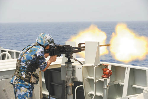 资料照片:2010年6月13日,一名特战队员使用重机枪进行射击。当天,正在亚丁湾、索马里护航的中国海军第五批护航编队特战队员在“广州”舰进行实弹射击训练。