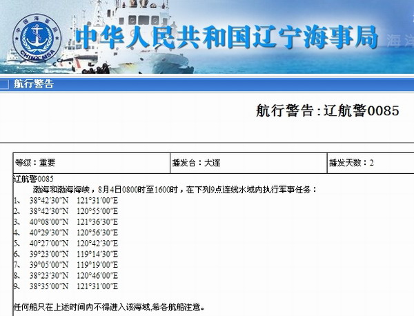 辽宁海事局网站截图 航行警告:辽航警0085 渤海和渤海海峡,8月4日0800时至1600时,在下列9点连线水域内执行军事任务: 1、 38°42′30″N 121°31′00″E 2、 38°42′30″N 120°55′00″E 3、 40°08′00″N 121°36′30″E 4、 40°29′30″N 120°56′30″E 5、 40°27′00″N 120°42′30″E 6、 39°23′00″N 119°14′30″E 7、 39°05′00″N 119°19′00″E 8、 38°23′30″N 120°46′00″E 9、 38°35′00″N 121°31′00″E 任何船只在上述时间内不得进入该海域,希各航船注意。 |