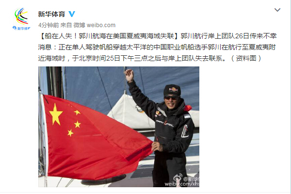 ![]() 北京时间10月26日晚,据新华体育微博消息,正在单人驾驶帆船穿越太平洋的中国职业帆船选手郭川在航行至夏威夷附近海域时,于北京时间25日下午三点之后与岸上团队失去联系。