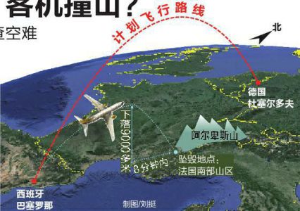 北京时间3月24日下午,一架由西班牙巴塞罗那飞往德国杜塞尔多夫的A320客机在法国南部海拔大约2000米的阿尔卑斯积雪山区坠毁,机上载有150人,可能包括不少德国、西班牙籍乘客。德国之翼航空公司负责人发布消息称,失事客机上没有中国乘客。 出事航班属廉价航空公司,机龄24年 出事航班号为4U9525,属于德国廉价航空公司德国之翼,德国之翼是德国最大航空公司汉莎航空旗下公司。 据报道,德国之翼此前一直拥有良好的安全记录,此前并未报出事故,该公司飞机平均机龄只有9年,不过出事的航班4U9525是一架24年机龄的A320。 不过,德国之翼公司24日晚表示,事故客机在前一天进行过检查,认为坠机应与机龄无关。德国之翼称,飞机机长在汉莎、德国之翼公司有超过10年工作经验,飞空客机型的经验超过6000小时。 根据法新社报道,出事航班是北京时间24日16:55从巴塞罗那起飞的,这比原定起飞时间晚了20分钟,起飞延迟的具体原因尚不清楚。 德国之翼在24日晚的新闻发布会上表示,飞机是在北京时间24日17:53与空管失去联系,当时飞机高度是6000英尺(1828米)。德国之翼公司还表示,飞机坠毁前有一段持续8分钟的下降过程。 机上人员 67名德国人 45名西班牙人两名婴儿? 根据德国之翼公司昨晚最新的官方表态,出事航班上共有144名乘客及6名机组成员。德国之翼24日晚举行新闻发布会称,出于对机上人员家属的保护,不会立即公布具体乘员名单,不过据信飞机上有67名德国人,有两名婴儿。西班牙副首相称,据信有45名乘客是西班牙人。 另据路透社称,德国小镇哈尔腾发言人称,“有理由相信该镇16名小学生和2名教师在出事飞机上”。 搜救困难坠机处是高海拔山区有积雪 法国总统称不可能有幸存者 根据法国官方消息,出事地点位于法国阿尔卑斯山区,坠机处海拔大约为2000米。具体地点在法国东南部小镇巴尔瑟洛内特附近山区,就在法国滑雪胜地普华露(Pra Loup)附近,该镇距离法国东南部城市尼斯100公里。 法国内政部官员说,已在上普罗旺斯阿尔卑斯省的巴尔瑟洛内特地区发现飞机残骸,从法国媒体拍摄的事发地附近照片来看,当地是高海拔山区,给搜救带来了巨大困难。法国前往现场的交通部副部长维达利说,客机坠毁的山区常年积雪覆盖,地面车辆难以进入,只有直升机可以飞越。 法国总统奥朗德已经将事故形容为“一场悲剧”,同时警告称,根据事发地周围环境判断,“不可能存在幸存者”。 法国救援队昨晚已抵达坠机现场,但是根据消息称,进入现场的路段都已结冰,他们花了很长时间才最终抵达。而一名来自坠机地点附近几公里城镇的宪兵表示,所有机上人员都已不幸遇难,没有一人生还。 法国新闻电台24日说,法国搜救人员已在失事现场找到飞机的一个黑匣子,当晚将停止搜救行动。 紧急应对法国出动军机搜救 德国总理默克尔感到“震惊” 事故发生后,@汉莎航空也在其新浪官方微博上发布了飞机失事的消息,称“汉莎航空以及德国之翼对此事件深表震惊及遗憾,并为本次航空所有乘客及机组人员深切祈祷。”另外空客公司已经表示,将派出一组技术专家去协助法国方面进行调查。 法国:事故发生在法国境内,法国出动军机展开搜救。法国总统奥朗德也向德国和西班牙政府通报了情况。 德国:德国总理默克尔得知事故后感到“震惊”,默克尔称德国、法国、西班牙都在为遇难者哀悼,将共同确定坠机原因。默克尔称将在今天前往坠机点。 西班牙:正在巴黎进行国事访问的西班牙国王菲利普六世决定推迟国事访问,并对遇难者家庭表示哀悼。 空难分析 坠毁前有8分钟下降过程 来不及拉起 客机撞山? 德法西三国将联合调查空难 第一,天气原因? 气象资料显示,客机在经过上普罗旺斯阿尔卑斯省巴尔瑟洛内特山区时,当地正在下雨,风速小于每小时7公里。法国官员表示,事发时当地气象条件并不是特别恶劣。飞机出现事故之前,巡航的高度接近1.1万米,这种高度不易受到恶劣天气的影响。所以,天气原因不太可能。 第二,技术故障? 这架空客A320飞机虽然有24年服役的历史。但德国汉莎安全维护一直不错,技术上不成什么问题。总体来看,事件应该是在转入平飞之后,飞机的操纵系统发生了故障(机械或人为失误),悄无声息地转为下滑,等发现时为时已晚,来不及人工操纵拉起,导致了这起悲剧。 第三,遭恐怖袭击? 仔细来看飞机坠毁前的轨迹,该航班航迹始终保持直线,空管没听到任何报告、求救,飞行员也没有对外做任何通联。最终在10分钟后高度降到2072米,进入目视可见地面的高度。据报,机组在最后时刻发出求救信号,但为时已晚。更不幸的是这里属于阿尔卑斯山区,当地山区海拔有2000米左右,飞机显然是撞山了。 从事故的模式分析来看,客机坠毁前有一段持续8分钟的下降过程,在8分钟内下降9000多米,基本属于高速下降,而同时它的飞行速度还在降低。所以专家现在倾向于认为要考虑人为因素。有可能是人为操作因素,也有可能是遭遇恐怖袭击。 显然不是定时炸弹类的恐怖袭击,这样瞬间炸开飞机失控甚至空中解体。也不太像是9·11式的飞机劫持,恐怖分子控制客机并操纵坠毁。因为机组最后在已经可以目视地面,发现山脉就在眼前的时刻,发出了求救。至于飞机双发动机都同时失效,这概率很低,而且飞行员会及时对外告警求救。 据德新社报道,德国安全部门表示,没有迹象显示A320