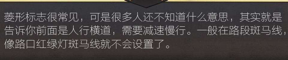 过了这个标线一旦发生事故,对车主的责任认定和处罚都会不同。看见人行横道本来就该减速,所以,以后开车千万不能“目中无行人”,而且还要注意一切道路交通标识。 |