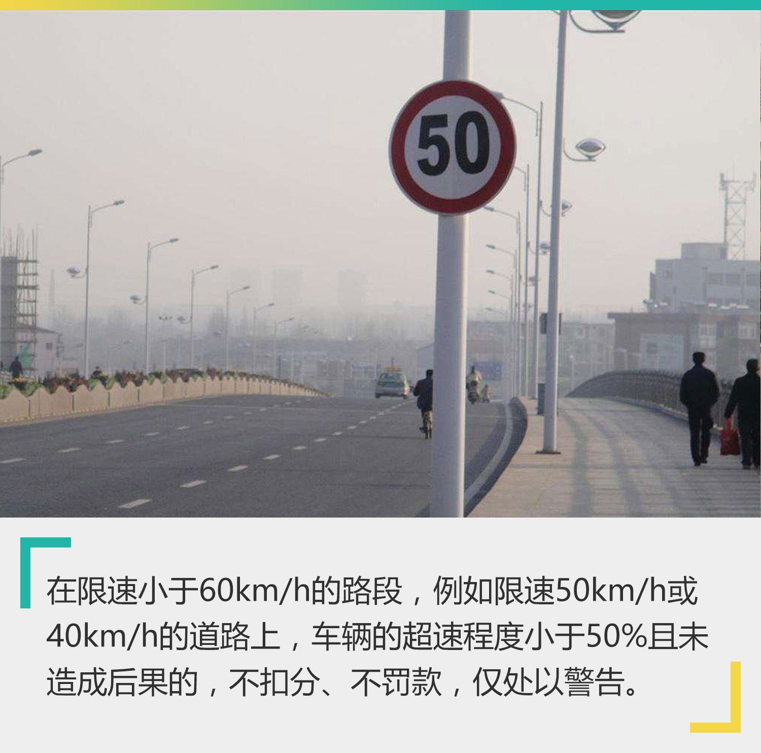 小编觉得这个规定还是挺人性化的,毕竟在一些限速本身就比较低的路段,驾驶员很容易因一时疏忽造成轻微的超速行为,但只要没有造成任何后果,完全有必要网开一面,给驾驶员一次改过自新的机会。 不过这里也有两个“死限”需要提醒大伙儿,一个是在限速小于60km/h的路段并不包含限速就是60km/h的路段。也就是说,如果您行驶在最高限速已经标明60km/h的路段上时,是不受这条规定的袒护的。再者就是,无论您行驶在何种道路上,也不管您驾驶的是什么车型,超速50%以上,都一定会被处罚。