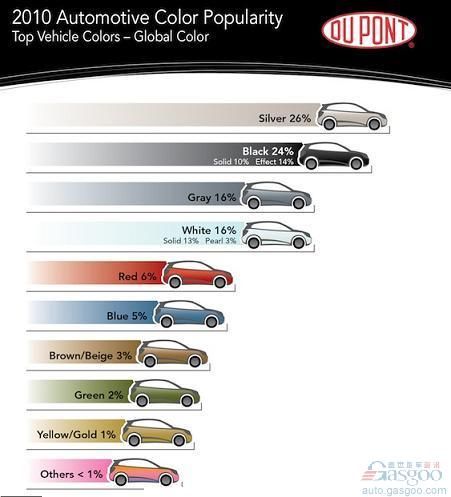 据悉,杜邦公司每年根据当年全球范围汽车的销售情况进行抽样调查,最后跟据各颜色汽车的流行度,对颜色喜好进行排名。 杜邦公司的调查报告显示2010年所销售汽车中银色车占26%;黑色车占24%;灰色和白色各占16%;红色占6%;蓝色占5%;棕色占3%;绿色占2%;金色占1%;其他颜色占1%。