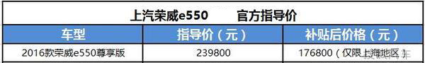2016款荣威e550尊享版为插电式混合动力车型,新车为荣威e550的新入门级产品,综合续航里程达600km,纯电模式下续航里程为60km。最关键的一点是:仅限上海地区的消费者,可获得5.4万元补贴,并享免费沪牌、免购置税、免车船税及其他优惠,实际到手价为17.68万元。