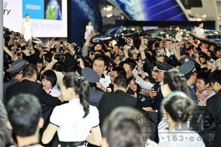 ![]() 4月24日上午上海的天空下着淅淅沥沥的雨,然而车展现场的E3展馆却人气爆棚,因为天王级巨星刘德华即将莅临Acura展台。距离活动开幕的时间还有1个小时的时候,整个Acura展台就被前来一睹天王风采的观众团团围住,主办方亦出动了不少保安人员维持现场秩序。在11点左右,随着Acura展台上的电子屏的倒数显示,围观的人群沸腾了,在观众的欢呼声和掌声中,一身精致绅士装扮的天王巨星刘德华登上了展台。