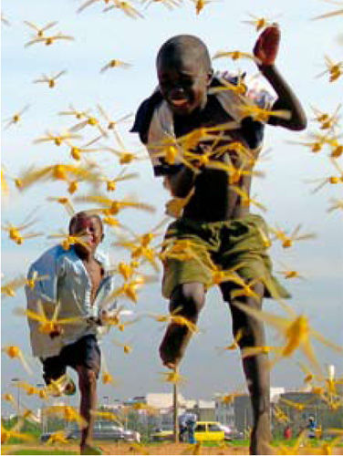 2004年,蝗虫群掠过塞内加尔。15年来,只有动用军事力量方可制止蝗灾。蝗虫群是慢慢形成的,当一对蝗虫飞过天空,就会吸引更多蝗虫与之不断地聚集,以致最终遮天蔽日。