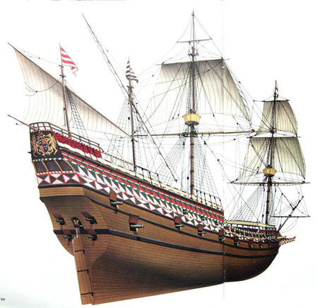 这艘军舰装饰华丽,但你不要以为它是“绣花枕头一包草”,它可是百战百胜的常胜将军呵。但是,具有讽刺意义的故事发生在1696年,一个军官不慎碰落了舱室里的蜡烛而引起的一场大火彻底焚毁了这艘堪称人世间精美佳作的军舰。
