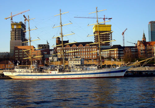 俄罗斯海军“和平”号风帆训练舰于1987年在波兰格但斯克建成,共同六艘同型舰,“和平”号为第三艘。该舰为全帆装型,长109.2米,宽13.9米,高52米,吃水6.3米,满载排水量为2771吨。该舰为风帆和柴油机混合动力,据称最高航速高达19节(风帆状态),曾被称为世界上最快的风帆军舰。该舰舰员在70-144人之间,最大载员199人。该舰母港为彼得堡,该舰一直为俄罗斯海军执行学员训练任务,经常访问包括英国、美国在内的西方国家。