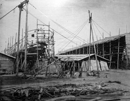 造船所需的船台也很快开始搭建,工人们用原始的打桩机,站在云梯上,数十人奋力拽动700斤的铁锤,将一根根长达6~10米的木桩慢慢砸入地面,夯实船台的地基,“星罗棋布,以固其基”,而后再在这块特别加固的地面上交叉叠放枕木,枕木间用长1米多、直径0.1米的铁钉钉连,架成一个前高5米余,后高半米余,长达76.8米的枕木船台,船台两侧另有巨木支撑。1878年12月30日,船政第一座船台大功告成,其余3座相似的船台也陆续兴工。