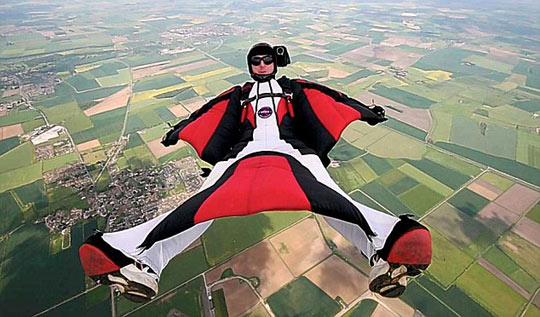 勇敢的“蝙蝠侠”,穿着特制的“翼服”,戴着头盔。