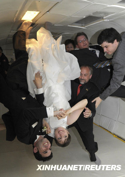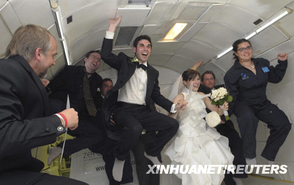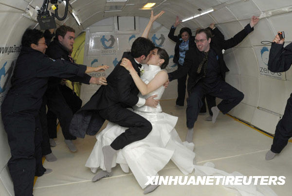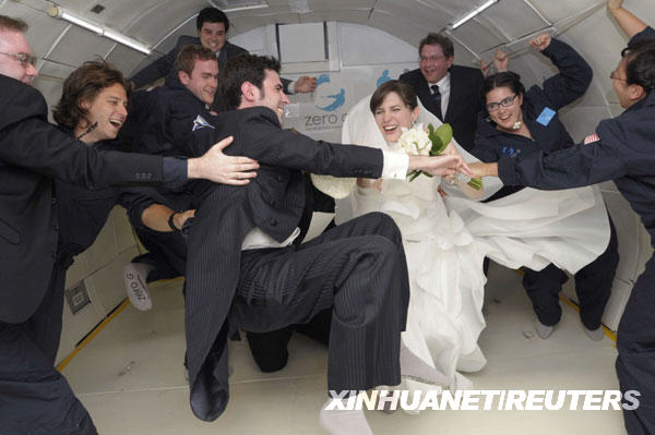 6月20日,来自美国纽约的诺厄·富勒莫和埃琳·芬尼根在一架特制的波音727型飞机上举行的“零重力”婚礼上接吻。当天,这对新人搭乘这架飞机从位于佛罗里达州卡纳维拉尔角的肯尼迪航天中心出发,成为世界上首对在零重力状态下举行婚礼的夫妇。新华社/路透 |