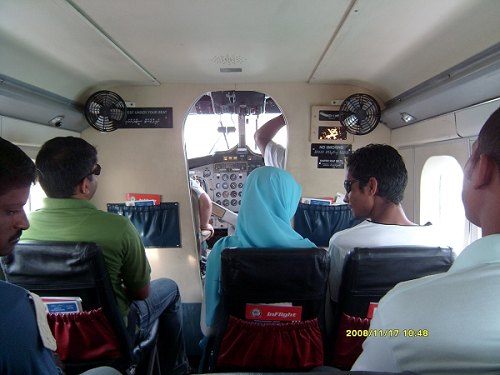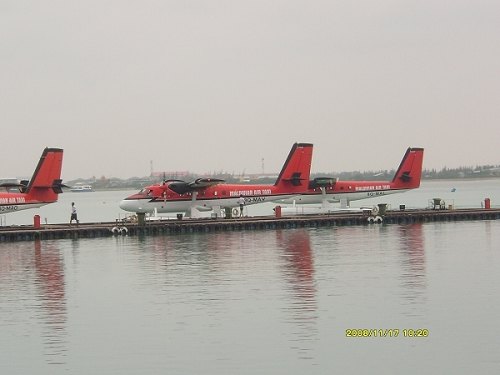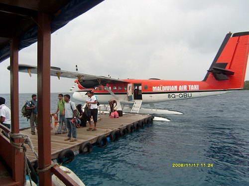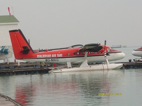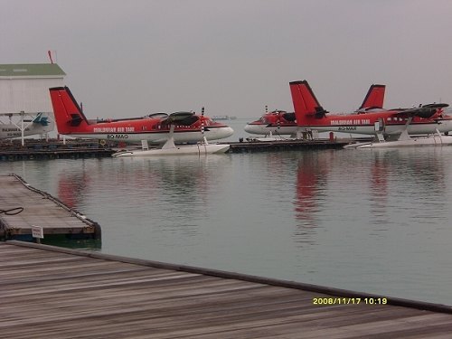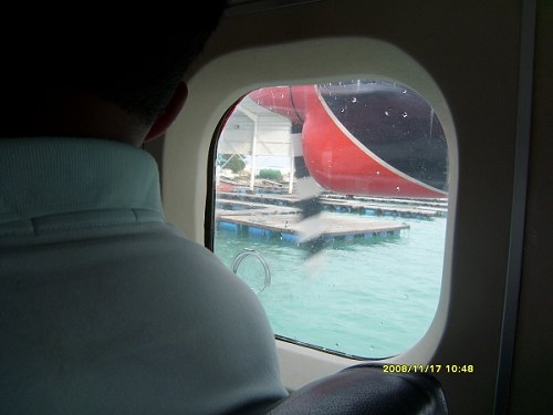 怀着忐忑不安的心情报了一个包含水上飞机的自由行行程,踏上了去马尔代夫之路。 记得到达那里是当地时间凌晨1点30分,但是清澈透明的碧蓝色海水,还是让刚到达马累的游客感到无比的兴奋,叽叽喳喳的不同语言中能听懂的都是赞美的词藻。在椰子岛睡了一晚上后,我迫不及待的又回到了马累,准备第一次乘坐传说中的水上飞机。好心的驱使,使我在飞行前1个多小时就早早达到了马累的水上飞机的码头,水上飞机的机场就是马尔代夫机场所在岛屿上的一处海湾,马尔代夫水上飞机的颜色分红与蓝两种,但以红色居多,机舱内可以搭乘十余名乘客。飞机巨大的引擎轰鸣声和螺旋桨旋转的速度,卷起海面阵阵涟漪,水上飞机入港后依次排队在等候调度的派遣,旅客们上上下下平均每隔几分钟就有一架飞机起飞或者降落,机场码头好一片繁忙景象。当地时间下午3点10分,终于我们也即将上机啦,不过不是计算机而是水上飞机。驾驶员热情的帮助我们把行李都放上飞机,让后再协助我们纷纷落座。