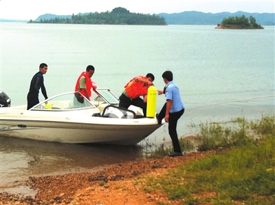 昨天下午1点多,大批救援人员集中在水库派出所码头。不多久,来自天津等地的救援人员也赶到码头,乘船前往事发水域救援搜索。据一名潜水员称,事发水域的水深在13米左右,水下能见度很低,潜水员只能靠摸索,给救援带来很大困难。