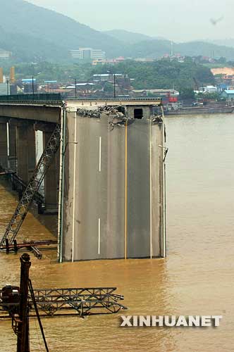 (资料图片)2007年6月15日,桥面垮塌的九江大桥。当日5时许,325国道广东佛山九江大桥发生一起运沙船撞击桥墩事件。九江大桥桥墩当场被撞断,桥面随之垮塌,长度大约有140米,交通中断。船上10名船员目前已全部被救起,其中2名船员受伤。新华社记者 周文杰摄
