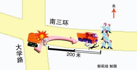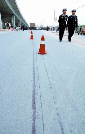 昨日下午,记者闻讯赶到现场。从大学路刚拐上南三环,就看见清晰的血迹伴着车轮印一直向东绵延,经测量,血迹长约200米。为保护现场,警方循着血迹临时放置了一排反光锥,一双破损的黑皮鞋,遗落在血迹带的东西两端。
