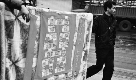记者在网友的发帖中看到,迎亲队伍喜气洋洋,走在一处水泥大道上,亲友们用类似竹竿的工具抬着毛毯,毛毯上可以清楚地看到很大的“囍”字。