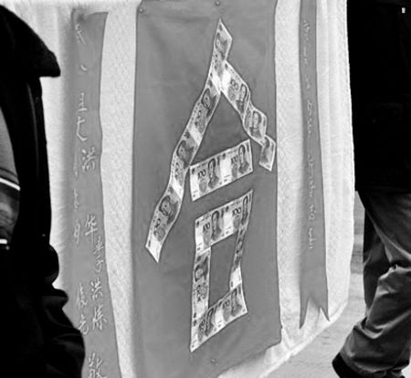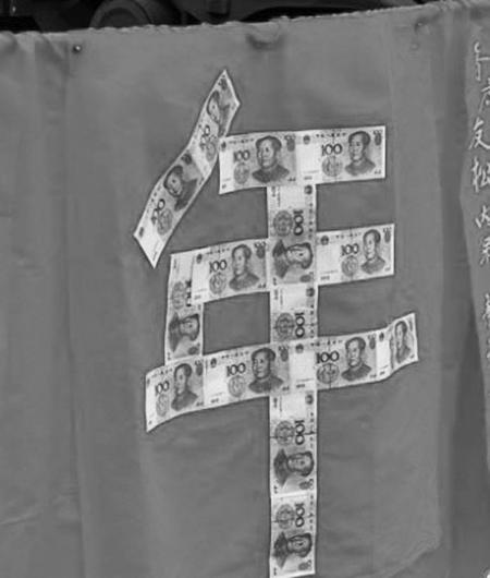 特别之处在于,这个巨大的“囍”字看起来是用百元人民币现金拼成,可谓非常养眼,行走在路上,回头率相当高。
