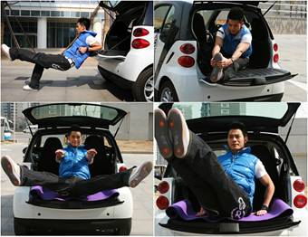 别看车身小,smart的后背空间可大有文章,上肢热身完毕,可以在这里进行一些下肢的练习,放下挡板做手臂和胸肌的练习,坐进车内可以伸展腿部,加上手臂的配合可以慢慢尝试难度很高的平衡联系,十分挑战腹肌,之前没有相应练习的请自重。