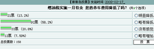 由调查结果我们可以得出:燃油税实施后,有71.8%的网友养车费用比以前降低。网友新闻网汽车发帖:燃油税实施是个好事。“两栖的鱼”回帖比较实在:能低点,低就比高好。但也有网友表示异议,网友吉祥霖:其实我个人感觉燃油税实行以来,我的费用有所增加,这个东西就是个省事不省钱,不用再去银行或者公路局大厅排队买养路费了!省事不省钱呀!