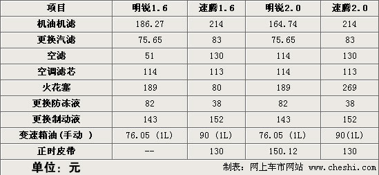 我们所列举的都是一些常见的车辆保养项目,因为各个4S店收取工时费用时会有不同程度折扣,因此我们暂不将工时费用列入对比。两款车型对比较为明显的主要体现在1.6升明锐所使用的发动机为链条正时结构,因此免去了更换正式皮带的费用。在两款车型的各项保养费用方面,很明显可以看出速腾的价格普遍略高于明锐。 常见易损配件