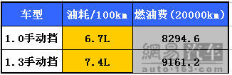 部分配件价格表: ![]() 三、油耗费用1.3手动版综合油耗7.4L/100km 奔奔的油耗在同级别中有点高,一个重要原因是自重较大,整备质量达到了1吨。奔奔的电子油门反映有些慢,车主往往在换挡后会深跟一脚油提速,这也是部分车主油耗高的一个原因。我们以一位网友三个多月行驶3500公里的油耗记录为例,计算出奔奔1.3手动挡的油耗为7.4L/100km。因为1.0L车型上市不久,可参考的数据不多,我们根据经验推测1.0L手动挡的油耗会在6.7L/100km左右(但是,因为个人驾驶习惯和驾驶环境的问题,在实际使用过程中还会有出入)。北京地区93号汽油的最新价格为6.19元/升,按照一年行驶2万公里计算,可以得到燃油费为: ![]() 过路费、临时停车费等以1200元计。综合以上费用,以奔奔1.3手动车型一年用车成本为:燃油费+车险+车船使用税+保养费+意外支出=9161.2+3800+480+751+1200=15392.2元。平均每月约1282.6元。 |