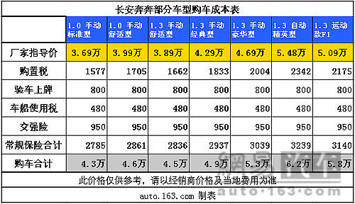 ![]() 网易汽车报道 长安-奔奔由长安汽车集团和世界著名的意大利汽车设计公司I.D.E.A联合设计打造的,奔奔搭载了1.3L全铝发动机。四万元出头就能买一辆动力充足空间比QQ大很多的微车让很多人动了心。俗话说“买车容易养车难”,因此,购车时不仅要关注购买成本,还要考虑到使用成本,即油耗和维修保养费用。下面我们就对奔奔以一年行驶2万公里为例分析一下用车成本给大家一个参考 一、购车成本,1.3手舒最低3万8 ![]() 购车费用常用公式:购车费用公式=裸车价(厂商指导价)+购置税+上牌费+商业保险+交强险+车船使用税 购置附加税:购车款/23.4(1.6升及以下);购车款/11.7(1.6升以上)1.6升以下排量的车型,购置税会得到减半的优惠政策。 验车上牌:此价格仅供参考,具体价格以各地验车上牌价格为准。 车船使用税:各省不统一,北京9座以下客车为480元/年,9座以上客车540元/年。 贷款买车的具体月供额,可到当地的4S店查询。 二、保养和维修 平均每年750元 长安奔奔车型的质保期限是2年5万公里,先到为止。首次保养建议在2000公里左右在4S店做,接下来的保养则按照3个月或者5000公里的周期来做,二保最好不要超过7500公里。奔奔小保一次的费用在120元左右,包括机油机滤和汽滤,汽油滤芯是每次保养都要换的,好在价格不高。奔奔在4000公里左右的时候保养项目比较多,变速箱油和火花塞都要换,总计417元。奔奔行驶6万公里的保养总花费为2254元,平均每年751元。每次保养的里程和保养项目的费用参见下表: