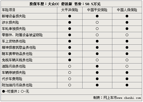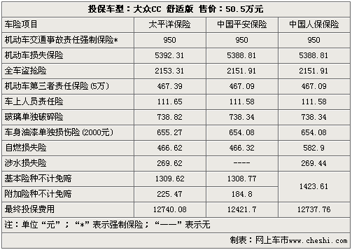 在太平洋、平安、中保等三家保险公司的保险项目里,机动车交通事故责任强制保险是一项强制保险项目,并且价格统一为950元整。除此之外,三家保险公司的车险项目基本保持一致,但相应的费率存在一定的浮动,其中中国平安保险的报价最低,太平洋保险的报价最。另外,在机动车第三者责任险中,消费者除了可以选取5万保险额外,还可以选择10万、15万、20万元保额等。而在车身油漆单独损伤险(常说的划痕险)方面,消费者也可以选取更高的保额如5000元、10000元不等。由于新车在第一年里属于汽车厂商的保修范围之内,所以自燃损失险可以不上。值得一提的是“不计免赔”这个险种,购买这个险种的最终的是消费者出险后保险公司可以百分之百的赔偿,反之则只能按照比例部分赔偿。