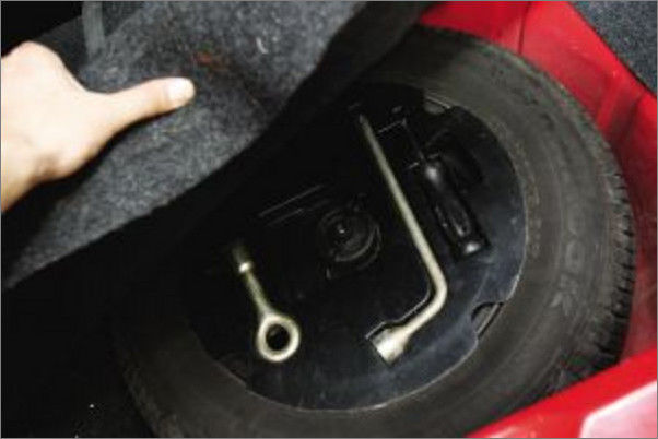 取出备胎(通常在行李厢下面)、轮胎扳手和千斤顶。