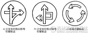 立交桥指示标志是指车辆在立交桥上的行驶标志,常见的有直行及右转标志、直行及左转弯标志和环岛行驶标志(图3-16)。