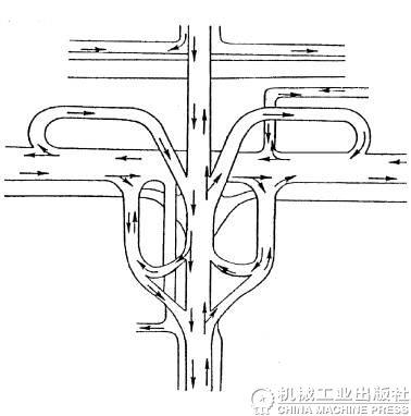 1) 分离式立交桥是指相交道路之间没有特设匝道的立交桥。它是一种最简单形式的立交桥,一般仅能保证直行方向的交通互不干扰。转弯车辆(特别是左转弯车辆)则根据其具体情况允许其在交叉口处平面交叉。分离式立交桥一般有分离式两层立交桥和分离式三层立交桥。车辆的正确行驶路线见图3-7。