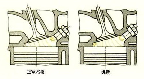 发动机冷却系统 爆震: 正常燃烧是由火花塞的电极间隙附近形成火焰核心,此火焰燃烧速度为30—40米/秒。而爆震则是远离火花塞的末端未燃混合气经过压缩后达到自燃温度,自身产生火焰提前引燃,此火焰燃烧速度为200—1000米/秒以上。比正常燃烧的火焰传播速度高几十倍,很容易造成发动机损坏。