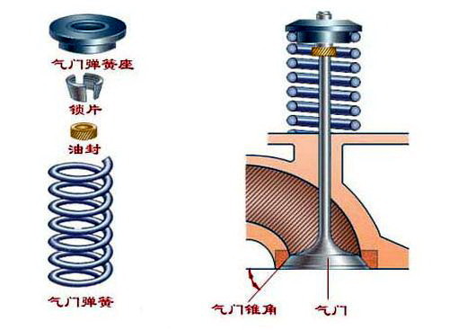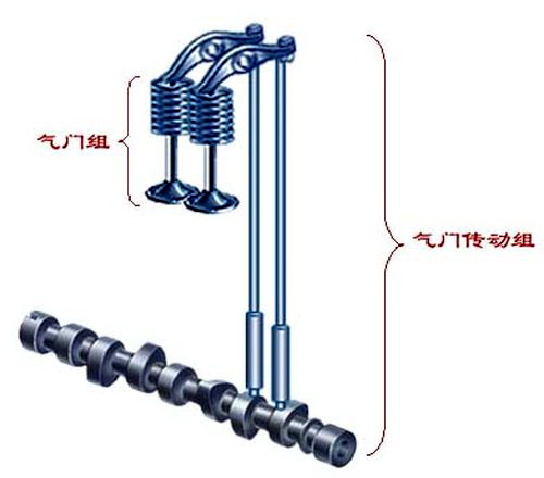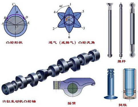 凸轮: 凸轮侧面呈鸡蛋形,目的在于保证汽缸充分的进气和排气。一般来说直列式发动机中,一个凸轮都对应一个气门,V型发动机或水平对置式发动机则是每两个气门共享一个凸轮。而转子发动机和无阀配气发动机由于其特殊的结构,并不需要凸轮。