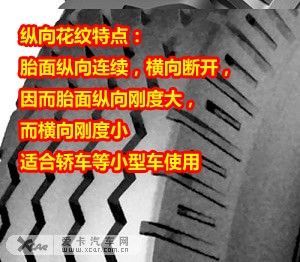这种花纹共同特点是胎面纵向连续,横向断开,因而胎面纵向刚度大,而横向刚度小,轮胎抗滑能力呈现出横强而纵弱的特征。这种花纹轮胎的滚动阻力较小,散热性能好,但花纹沟槽易被嵌入碎石子儿。综合来看,这种型式花纹适合在比较清洁、良好的硬路面(如城市道路和高速公路)上行驶。例如,轿车、轻、微型货车等多选择这种胎纹。