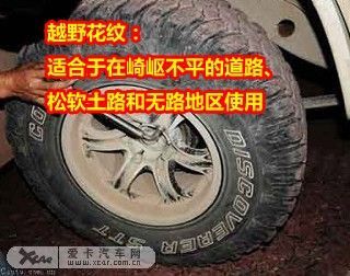 越野花纹的共同特点是花纹沟槽宽而深,花纹块接地面积比较小(约40%~60%)。在松软路面上行驶时,一部分土壤将被嵌入花纹沟槽之中,必须将嵌入花纹沟槽的这一部分土壤剪切之后,轮胎才有可能出现打滑。据测试:在泥泞路上,同一车型的车辆使用越野花纹的牵引力可达普通花纹的1.5倍。