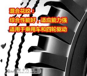 混合花纹是普通花纹和越野花纹之间的一种过渡性花纹。其特点是胎面中部具有方向各异或以纵向为主的窄花纹沟槽,而在两侧则以方向各异或以横向为主的宽花纹沟槽。这样的花纹搭配使混合花纹的综合性能好,适应能力强。它既适应于良好的硬路面,也适应于碎石路面、雪泥路面和松软路面,附着性能优于普通花纹,但耐磨性能稍逊。目前,一些货车和四轮驱动的乘用车多使用这种型式的花纹轮胎。
