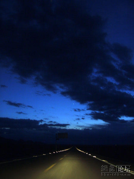 另外有趣的是临近格尔木,会的车开始多起来,我看到来车近了就关了远光灯,对方也关,开了一小会,没相会,又看不清路,便有打开,对方也打开,又觉得该到了,有关了,对方也关,还没到,又开。。。如此往复。相当纳闷,直到开了起码50公里以上,我们才真正的相会了。能见度太高了。后来有了经验,看到来车,开个半小时才差不多才会相会。特别是看到格尔木在荒漠中辉煌的灯火,直到开进城,足足花了一个小时。