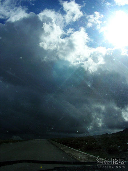 乌云压头,不免暴雨。青海的天气很容易辨识,乌云下就是雨,一出乌云就是晴。于是不断的一会晴一会雨。不过这一次的超特大暴雨,让我领教了厉害,已经完全没有能见度可言,只能打着应急灯停在路边,就是这样,还是但心后面的来车看不到应急灯而追尾。幸好路过的车并不多。雨打在车顶震耳欲聋,似乎打穿车顶是分分钟的事,真的有这种错觉。车窗外除了水还是水,就跟车掉进了湖里似的,想象着四周是茫茫戈壁,只有我们和派派孤独的停留在无人知晓的地带,竟然有一些慌乱。默不作声(就算说话也根本听不清楚)的看着前面,其实没有前面可以看。车内空气开始憋闷,更加烦躁,只有等待。幸好如此暴雨只有20分钟,老天开眼啊,迫不及待打开窗,那冰凉清冽空气涌进来,不由自主打了一个冷战。