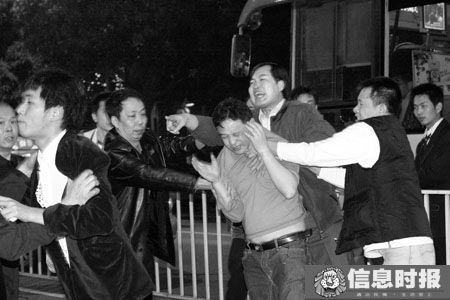 ![]() 两男醉酒驾警车肇事打人推搡交警 ●气愤的市民拦下想逃的“粤AA150警”并报警 ●“你们去问问,知不知道我是谁?” ——从警车上走下来满脸酒气的男子推开交警对人群叫嚣 “他们下车的时候满身酒气,叫大家让开。说再不让开叫人来抓我们。” ——面包车司机对记者说 信息时报2月5日报道 前晚11时06分,在广州市海珠区宝岗大道广州妇幼保健院附近发生一起4车连环相撞交通事故,有2人受伤。 据了解,造成事故的肇事者是一辆车牌为“粤AA150警”的警车,车上的两名男子都是满身酒气,其中开车者涉嫌酒后驾驶。事故发生后两人态度恶劣,其中1人还动手打人。记者随后向广州市公安局了解,证实该车不属市公安局辖下的警车。 车祸现场: “粤AA150警”追尾候灯三车 事发后不久,记者来到车祸现场。现场挤满了围观市民,宝岗大道交通一度瘫痪,消防队员和警方先后到场进行处理,而车祸2名伤者已被救护车送往附近的广医二院救治。记者看到事故发生地位于宝岗大道一红绿灯前方,共有4辆车头尾相撞,其中第一辆和第三辆是的士车,第二辆为一白色面包车,第四辆则是白色警车,牌照为粤AA150警,现场颇为惨烈,到处是碎玻璃和被撞烂的车辆零部件,尤其是夹在中间的第二辆面包车,车头车尾都被撞烂,2名伤者也都是这辆面包车的乘客。 记者随后前往广医二院医院采访,经过包扎检查之后,2名伤者伤势已无大碍。伤者叶燕群对记者说:“当时我们全家刚去南海拜年回来,事发时我们正在等红灯,就在绿灯亮起的时候,忽然被撞,我坐在面包车后面右侧,撞得头破血流,而车门又打不开,坐在旁边的妹妹则晕过去了,当时实在太可怕了。” 目击者: 肇事警车想逃被群众拦下 据目击者何先生称:事故发生时自己正在对面打电话,当时前面3辆车正在等红灯,而这辆白色的警车从后面直冲过来,速度很快,撞上了前面的白云的士,在巨大冲击力下,白云的士车又撞上前面面包车,面包车再撞上前面的士。当时接连听到“砰”、“砰”、“砰”三声巨响。撞车后,面包车里2名女子头破血流,被困在车里面,白云的士车门也打不开,司机在拼命呼救,周围市民急忙报警求救,并聚拢一起帮忙。但就在大家施救的过程中,肇事车却想伺机溜走,但被周围市民拦下。 态度蛮横: 男子撒泼打人推民警 据了解,肇事警车被拦下后,车上2名男子不得已下车,但态度非常蛮横。“开车的是一名穿黑色衣服的男子,大概40多岁,坐在副驾驶位的是一个穿浅红色衣服的年轻男子,他们下车的时候满身酒气,叫大家让开,说再不让开叫人来抓我们。这时候现场围观市民越来越多,警察也来到现场,穿黑衣服的男子趁乱离开,只剩下穿浅红色衣服的男子。”面包车司机陈志光对记者说。 在现场,记者看到该名穿浅红色衣服的男子在不停打电话,该名男子身高大概1米65左右,情绪暴躁,挥舞手臂。在接受警方调查时,该名男子忽然一拳将旁边面包车司机的儿子陈家文打倒在地。随后还推开前来执勤的交警。“你们去问问,知不知道我是谁?”该名男子向人群叫嚣,现场一片混乱。 (本文来源:信息时报 作者:张昊) |
