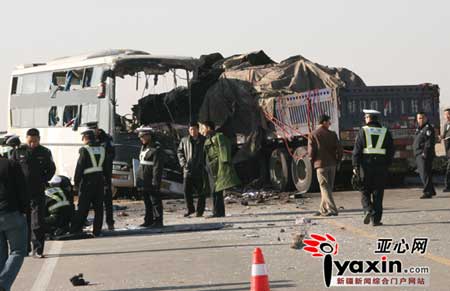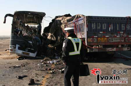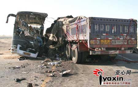 中新网乌鲁木齐12月2日电(汪金生 李凌)2日晨8时40分,国道314线库车境内发生一起特大交通事故,目前已造成21人死亡。 据阿克苏地区库车县运管站站长佟耀辉介绍,当时,一辆载满29人的夜班客车由阿图什市驶往乌鲁木齐,行至国道314线库车境内762公里处时,与一辆拉煤的大卡车相撞,两车均严重受损变形,事故造成运煤卡车上3人中2人死亡,客车中18名乘客当场死亡,另有1名乘客在送往库车县人民医院后救治无效死亡。 事故发生后,新疆阿克苏地区立刻启动应急预案,交通部门负责人都已赶赴现场参与指挥救援,库车县已成立救治小组,有关事故原因正在进一步调查中。 目前,事故中的伤员均在库车县人民医院救治,其中两人伤势严重。 |