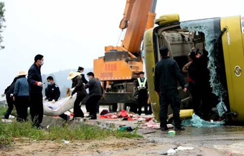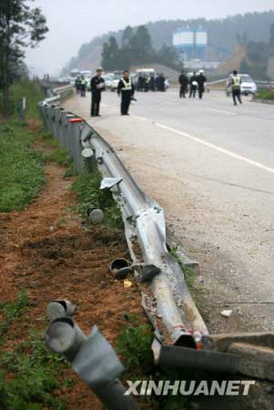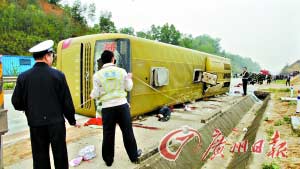 大巴惠州侧翻14死 由江西往深圳 疑有摩托违规掉头客车避让出事 “出警20多年,还从来没见过这么惨烈的车祸现场。”现场一名交警 3月13日下午1时30分,一辆从江西省赣州市定南县开往深圳市宝安区的江西籍大客车(核载55人,实载57人,按照有关规定不属于超载)行驶至惠州市惠城区金龙大道时失控侧翻,造成14人死亡(其中13人当场死亡,1人送医院抢救无效死亡),10人受伤(其中3人重伤)。接报后,惠州市委书记黄业斌,市委副书记、市长李汝求立即作出批示,要求全力救治伤员,妥善做好善后工作。黄业斌书记并带领有关领导和单位负责同志赶赴现场指挥处置工作。 事故发生后,省委、省政府高度重视。中共中央政治局委员、省委书记汪洋,省委副书记、省长黄华华,省委常委、常务副省长朱小丹,省委常委、省委政法委书记、省公安厅厅长梁伟发,副省长雷于蓝、佟星等省领导同志立即作出批示,要求全力抢救伤员,把死亡人数降到最低程度;尽快查明事故原因,及时发布相关信息;妥善做好死伤者家属安抚等其他善后工作。根据省领导同志批示精神,省政府副秘书长林英及省公安厅、安全监管局等有关单位负责同志先后赶赴事故现场,指导事故处置工作;省卫生厅迅速派出专家组赶赴惠州市,指导伤员救治工作。 伤员救治、事故原因调查等善后工作正紧张有序进行 事故发生于昨天中午1时30分左右,记者2时接到报料赶到现场时,看到一辆车号为赣B66656的江西定南县开往深圳宝安的大客车整个侧翻在金龙大道龙门往惠州行车道上。车头和车尾玻璃全部被逃生的人们打碎了。 车厢里的情况惨不忍睹:衣服、行李与尸体混在一起,有的尸体头或脚伸出车窗外被压在下面,粗略看大约是八九具,而车后10多米处还有2具被摔出来压死的尸体,从现场情况看,不少尸体躯干都不完整。其中还有一名不到1岁的婴儿被怀抱在母亲手中,脑部严重被挤压致死。 事故发生后,车上的4名司乘人员及没伤的乘客及时砸开车玻璃自救。当地公安、交警、消防、医疗机构迅速赶到现场,将重伤者送往惠州各大医院救治,其中距离最近的惠康医院收治伤员最多。 据身佩定南县汽车运输公司工作证030号的女售票员介绍,他们这辆大巴当时载客53人,另外还有4小孩。经过惠州小金口金龙大道广惠高速、广梅汕铁路上面的高架桥时,时速大约60多公里。没想到对面车道上的一辆男装摩托车在没有中间隔离杆的地方突然掉头,客车司机急打方向盘,将车子从超速车道转向中间车道,车子左侧右晃,最后撞到中间隔离带后又冲到右边护栏,然后就翻车了。 司机黄先生告诉记者,当时他换班后正在驾驶室后休息,车由姓谢的司机驾驶。谢师傅已经被警方控制。他也已经将情况向公司汇报,公司方面正派人前来处理。 车侧翻后继续前冲 记者在现场看到,车后数十米远的路边隔离带被撞开,车道上还显示了大客车呈蛇形的刹车痕迹,有二三十米长。侧翻后的车体又往前冲了一段距离,这可能才是人员大量死亡的原因。 现场3名未受伤的乘客中有两名是中年女性,她们相互搀扶着坐着,两人头发凌乱,衣服上全是泥。 “我现在脚也是软的,爬出来好一会我脑海中一片空白,全身发抖。就在我想找个人依靠时,认识了她(旁边的乘客),彼此聊了好久,心才渐渐平静下来。”廖女士介绍,当时她没注意到车外的情况,只感觉到车子突然一阵巨大的摇晃,一声不大的响声后,感觉身体失去了平衡,不少人都东倒西靠跌成一团。她强撑着从车厢上面的气窗爬了出来。 相关新闻 东莞 四车连环相撞 昨日下午3时许,东莞莞樟路东坑路口的高架桥入口发生一宗四车追尾的交通事故,一辆小汽车因为开得慢,被一辆货车撞上,而货车后面的一辆货车为了避让,转方向盘撞了护栏,而后面一辆车又将追尾货车撞上,事故没有人员受伤,但造成该路段的交通严重堵塞,事故原因,警方正进一步调查。 据现场交警提醒,下雨天气容易引发交通事故,驾车时要降低车速,注意前面的车辆,同时要打开雨雾灯,谨防交通事故的发生。 从化 啤酒货车侧翻 昨天上午,一辆湖南长货车满载一箱箱啤酒,取道广韶公路由东往西。刚好行经从化街口木壳岭路段,其后面的车厢突然倾斜侧翻,导致车上满载的啤酒一箱箱翻落车外,令靠近隔离墙的一条车道堵塞。昨天下午,现场恢复通车。 |