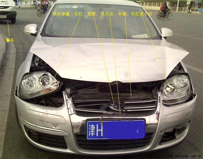 车损情况: 我的车损失惨重,前脸部分能碎的全碎了。大家平时说的追尾还能毫发不损我真的不相信,车头是全车最脆弱的部分,撞车的瞬间感觉像揉碎了几块玻璃。应该是吸能设计--撞的时候一点前冲的感觉都没有。 单从本次事故来看:老捷达不是一般的结实,基本没事儿;我的车其他部分完全正常,后来又开了二十多公里,楼下再慢叙。
