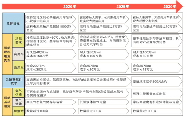 我国氢燃料电池汽车产业技术路线图 2、燃料电池动力系统作为新能源技术研发和产业化重点突破领域。 目前我国燃料电池发动机与国际先进水平相比在功率密度、耐久性、能耗等方面仍存在一定的差距。《规划》提出,我们要突破重点领域,引领产业转型升级,加快新能源汽车技术研发及产业化。利用企业投入、社会资本、国家科技计划(专项、基金等)统筹组织企业、高校、科研院所等协同攻关。