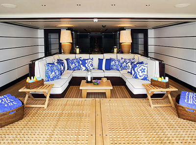 中庭的家具摆放十分正规,但显得很自然。正前方摆放着可以容纳14个人的餐桌,所有家具都采用非常好的材料手工打造,包括了名贵的木头、皮革、大理石、镀镍材料,另外还布置有青铜器皿和艺术品。所有这一切让人觉得安详和平静。Silverline公司出品的游戏桌被放置在上甲板的会客室中,可以进行多种形式的娱乐项目。 |