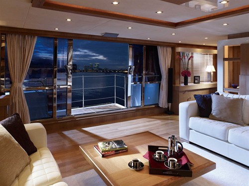 在南安普敦船展中华丽现身的首款Predator 130“邪恶百合”号带给人们的第一重深刻印象便是空前宽敞的艉阱,而以清雅素淡的橡木材质构筑而成的客厅则延续了艉阱的空间感。整个客厅中最具创新意味的设计是两个位于船舷两侧且向外延伸而出的阳台,这两个阳台以液压启动方式进行操控,能够自由开闭,在联动室内与露天的同时,又不会破坏客厅的整体布局。