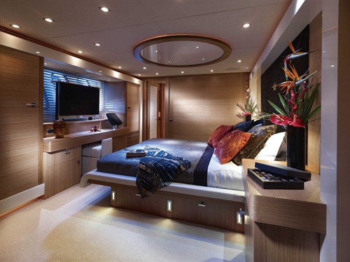 “邪恶百合”号的主舱同样位于主甲板层,房间的宽度横跨整艘游艇,与客厅一样,主舱内同样安设了依靠液压操控的阳台,为船东打造出一个专属的私人观景平台。如此富有新意的设计在南安普敦船展中得到了与会观摩者的一致垂青,为此Sunseeker公司正计划将该设计进一步推广,沿用到品牌旗下的其他船型中。
