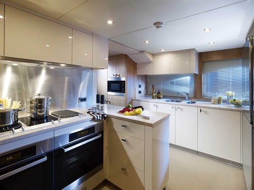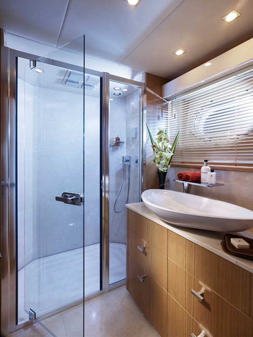 厨房与餐厅的位置一定不会相隔得太远,顺着餐厅继续向前就会发现位于左侧的厨房,正对面则是通往飞桥甲板层的楼梯。Predator 130的飞桥甲板层除了在净高上存在一些限制外,几乎涵盖了所有你能想到的水上休闲娱乐设施,那个如同巨型玻璃杯的日式按摩浴缸会是不少女士的第一选择。对于亚洲船东来说,能够在飞桥甲板层见到伸缩式遮阳顶篷,可能会大大激增他们的购买欲望。已经签下订单的那三位香港船东,想必正是冲着这点而来的。身处亚热带的香港水域,绝对少不了遮阳顶篷的庇护,但倘若成日委身在遮阳顶篷下,亲近阳光与水的自然闲情就会损失大半,唯有灵活自如的伸缩式遮阳顶篷才能完美满足这些略显挑剔的要求。