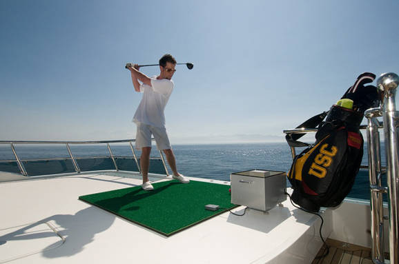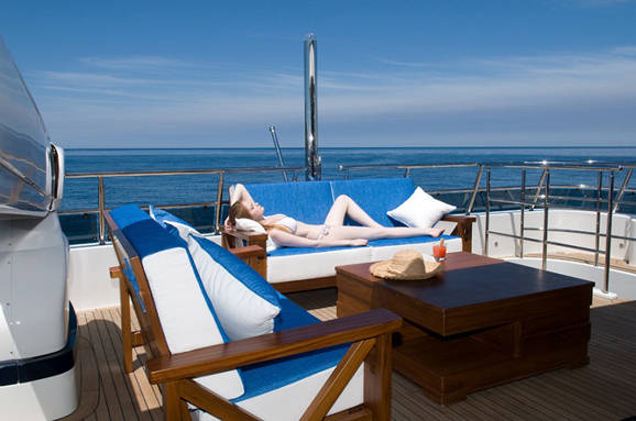船上还预留出广阔的露天空间以供乘客娱乐与休息。例如主甲板后面的露天餐厅和装备有硬顶的太阳甲板,该甲板也同样配备了酒吧和太阳浴设备。更具特色的无疑是放置在太阳甲板后面的高尔夫球座,由此可见游艇设计者的细心周到。