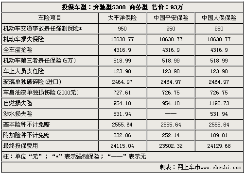 奔驰新S级轿车继上海车展全球首发后已于日前正式上市,全系8款车型售价为93万元-259.8万元。那么在购买奔驰新S级轿车后,其保险又将如何选择呢?下面我们将北京地区太平洋(601099,股吧)、平安、中保三家保险公司对奔驰新S级轿车入门车型的投保费用进行详实解析,以便为您购车提供一定的参考。 一、主要险种及附加险种费用