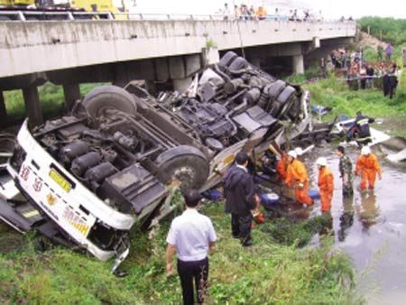 昨日11时许,一辆辽籍大客车侧翻在长平高速公路靠山屯服务区南段一3米高桥下。记者在现场看到,事故现场已经被警戒起来,大客车是冲出右侧护栏跌入桥下水坑的,该车车头朝南,侧卧于桥下水中,水深有30厘米,车体严重变形,所有玻璃全部破碎,乘客物品散落在水里。